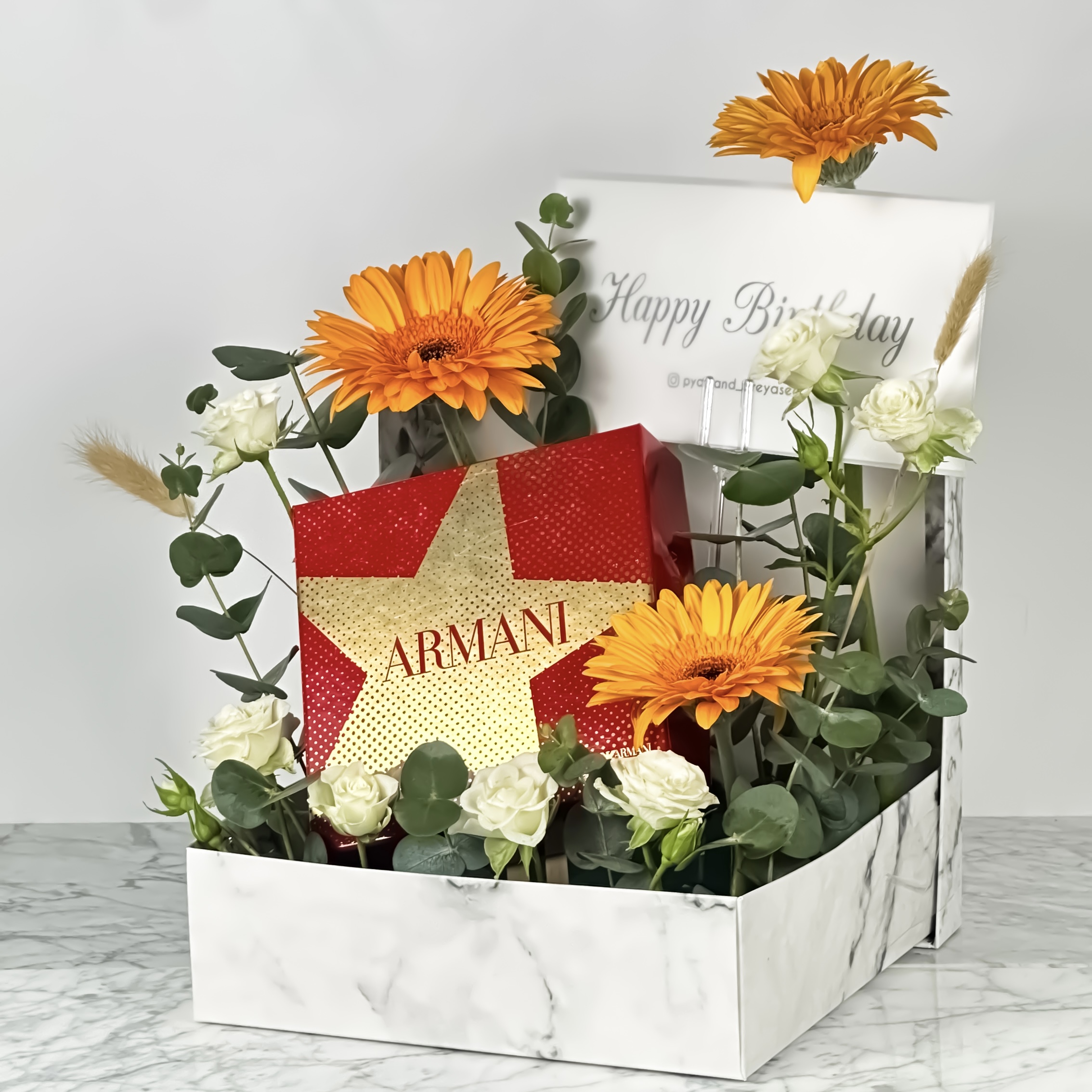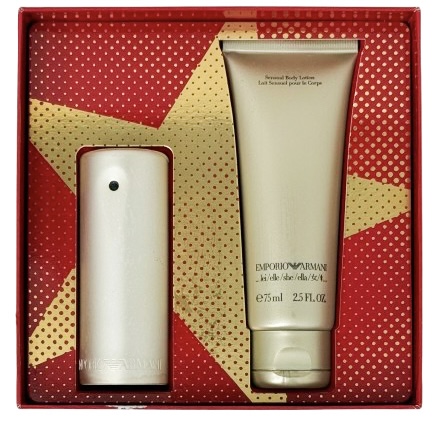 A medium-sized gift box containing an Armani set: 75ml perfume and 30ml cream
